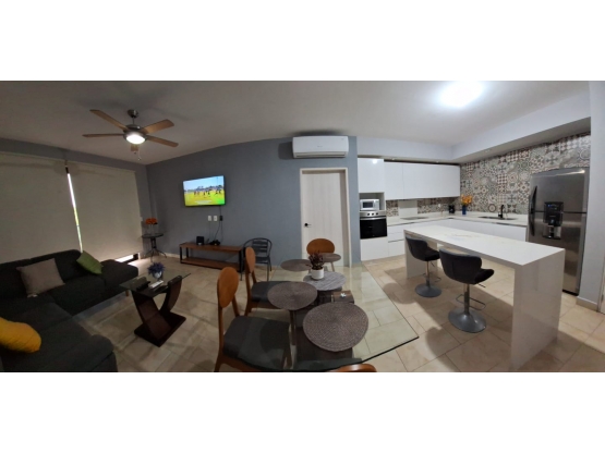 Para tu comodidad, el departamento está amueblado con muebles de estilo contemporáneo y cuenta con aire acondicionado en todas sus áreas, para que puedas ajustar la temperatura según tus preferencias. Además, su sistema de control de ruido garantiza un ambiente tranquilo y relajado en todo momento.